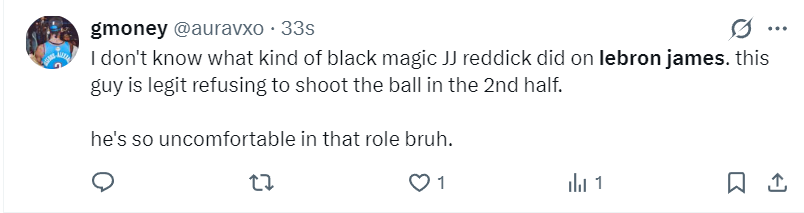 湖蜜:我不知道雷迪克是怎么设置的战术,他不让詹姆斯在下半场投篮了,詹姆斯在下半场有机会都不投,詹姆斯在这个角色中太不自在了。