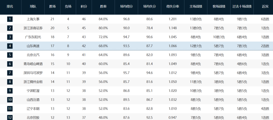 拥有张镇麟和怀特塞德等新援的上海队已冲到榜首位置以21胜4负傲视群雄,今年大有登顶的势头,卫冕冠军广厦队20胜5负紧随其后,广东队18胜7负第三,山东队17胜8负第四。